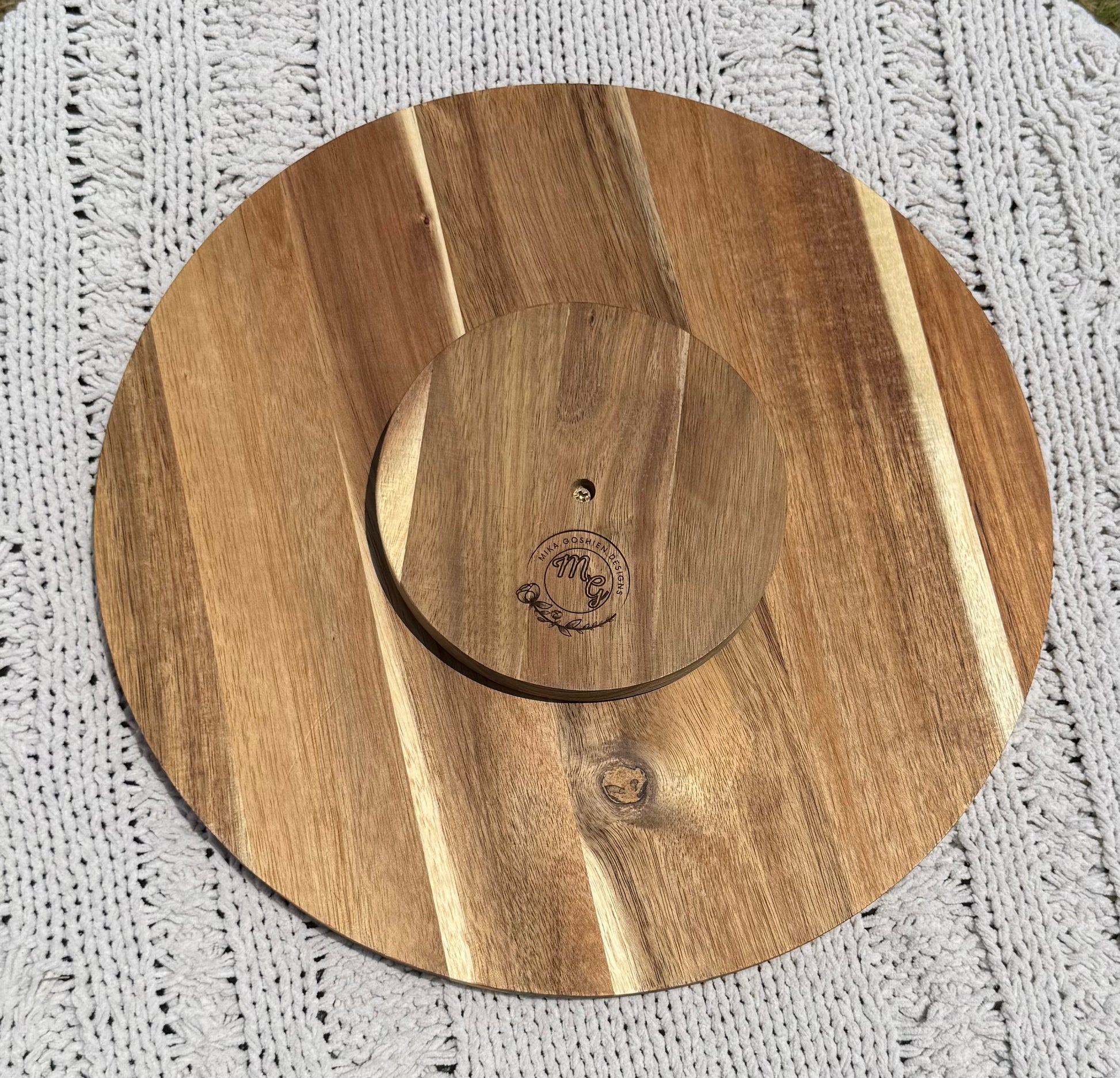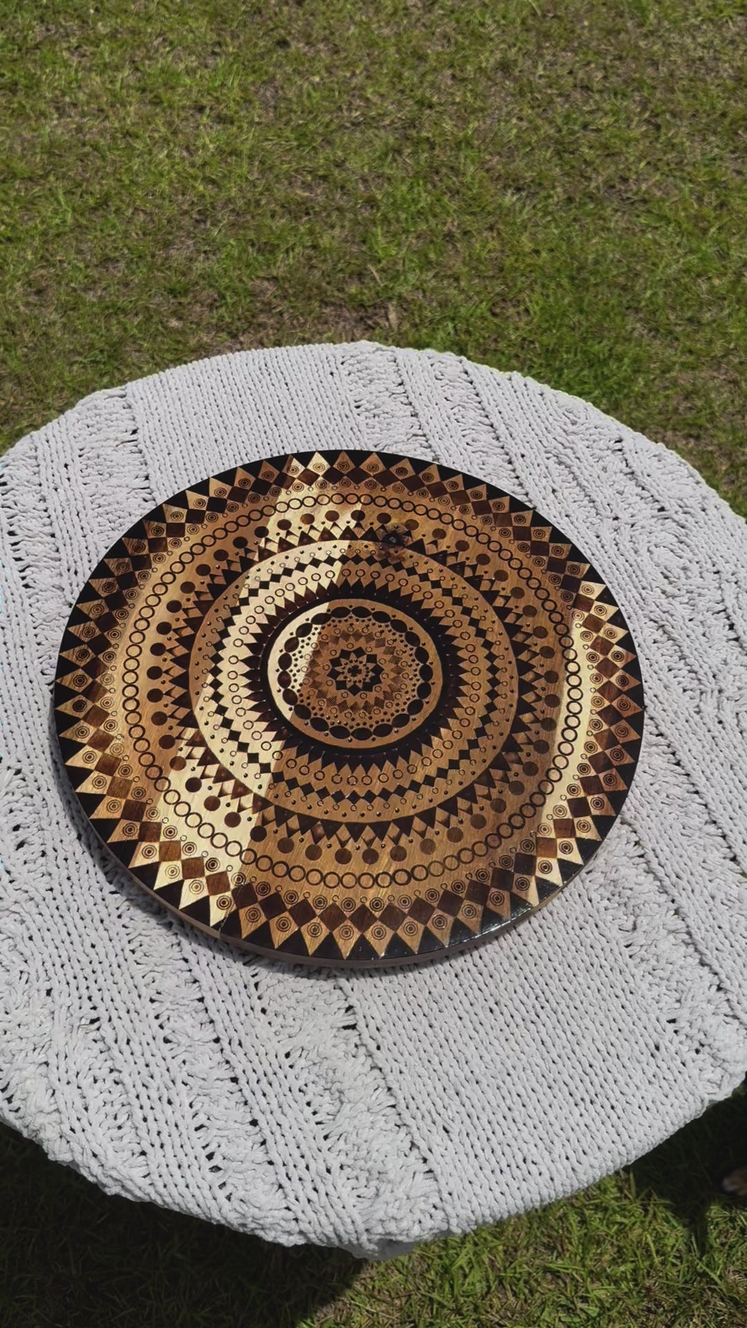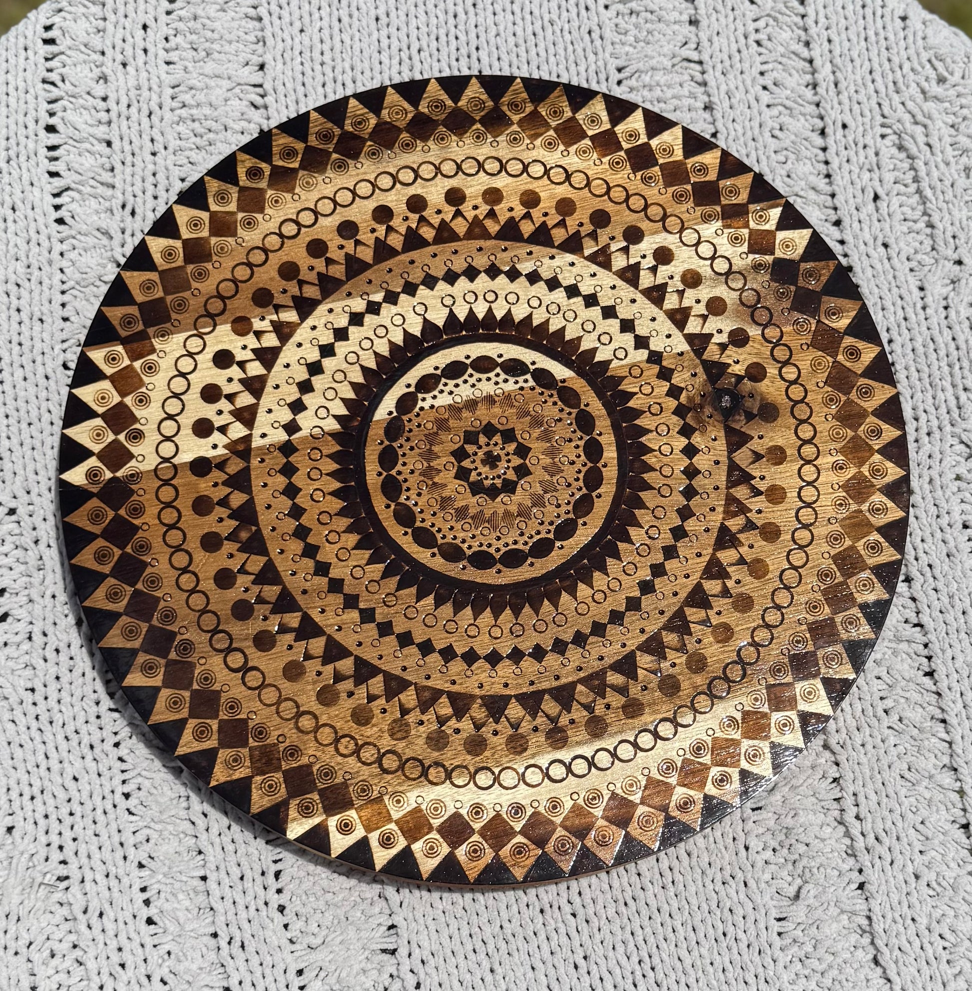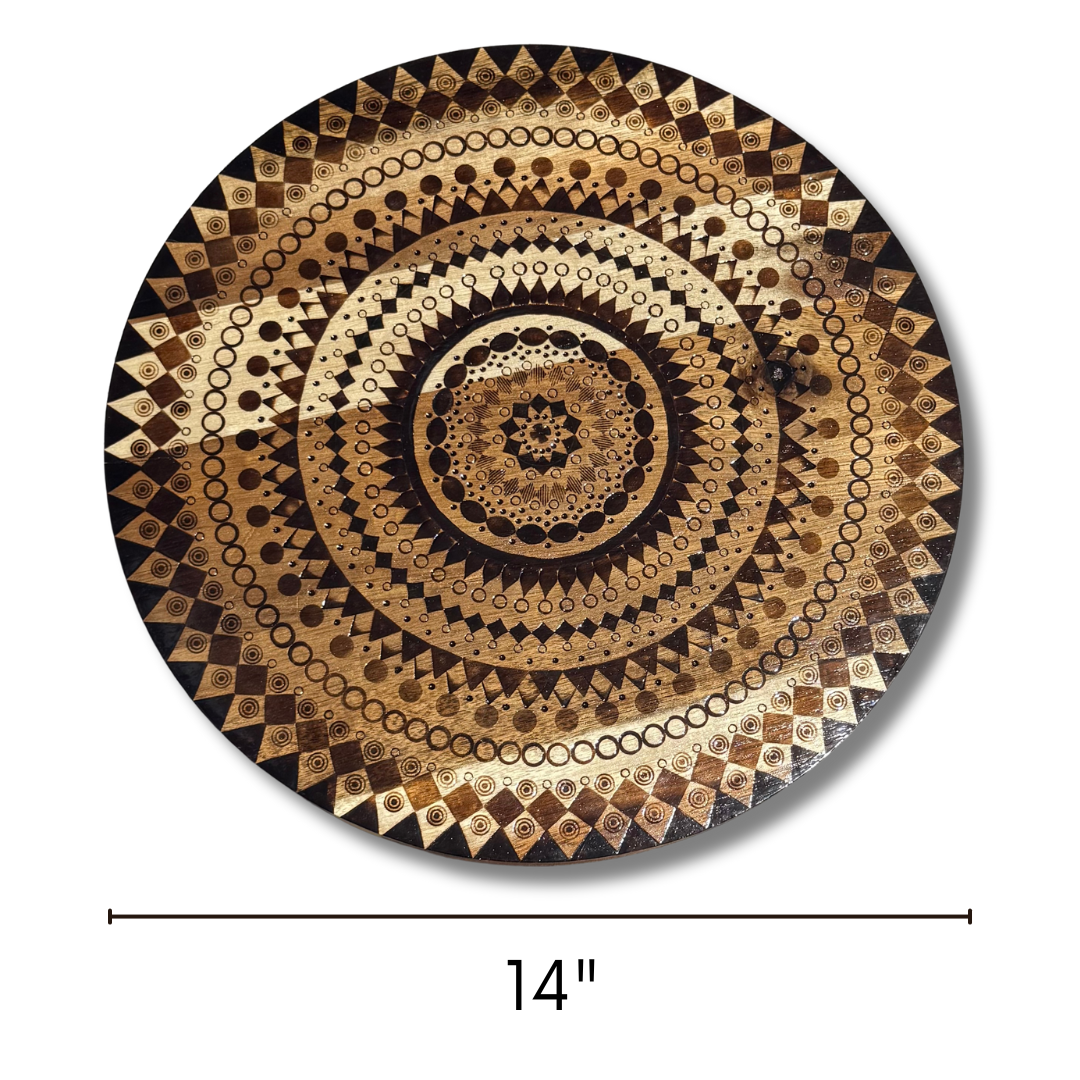 Bring both function and artistry to your table with this stunning 14" Lazy Susan. The surface features an intricate mandala design, meticulously wood burned by hand, giving it rich texture and timeless elegance.