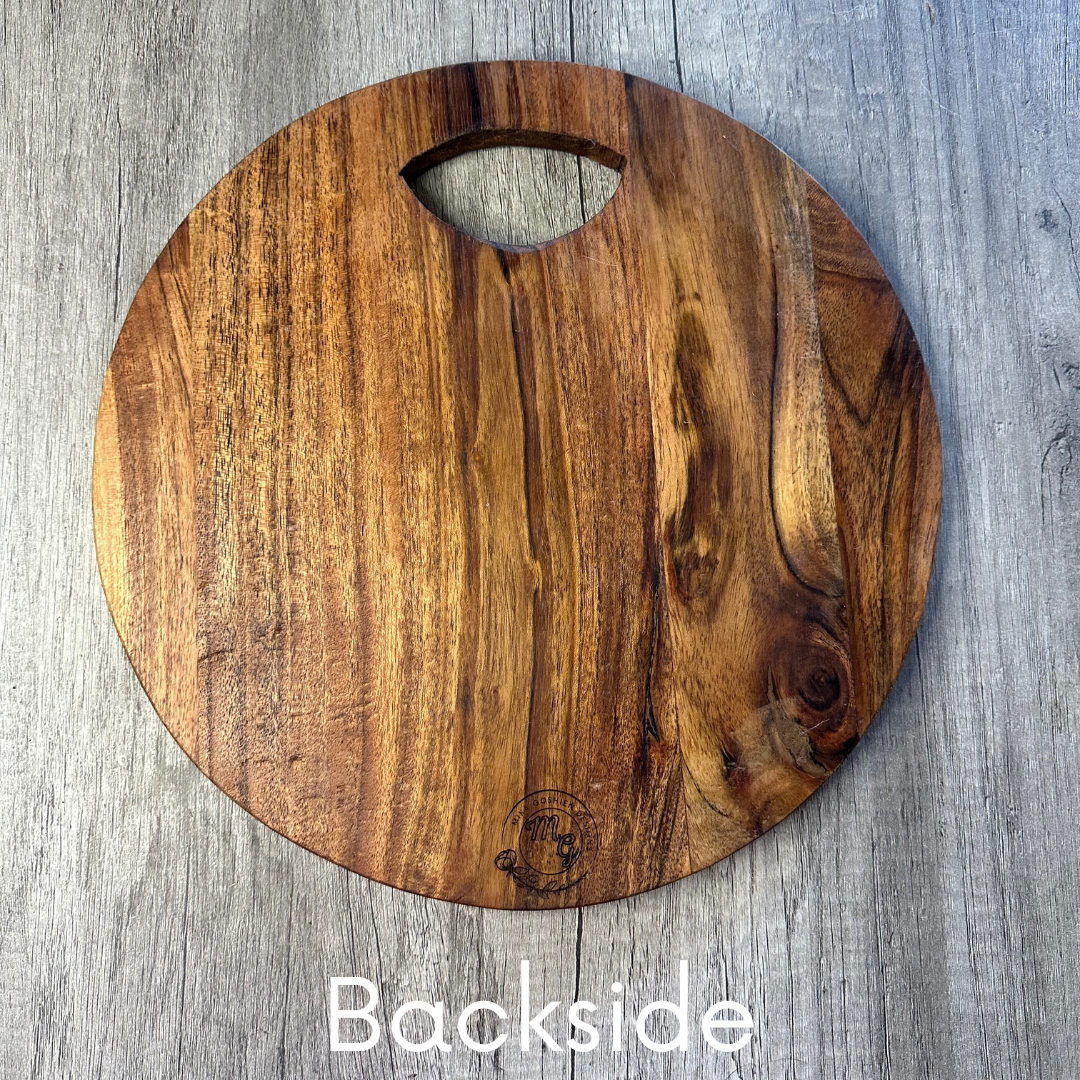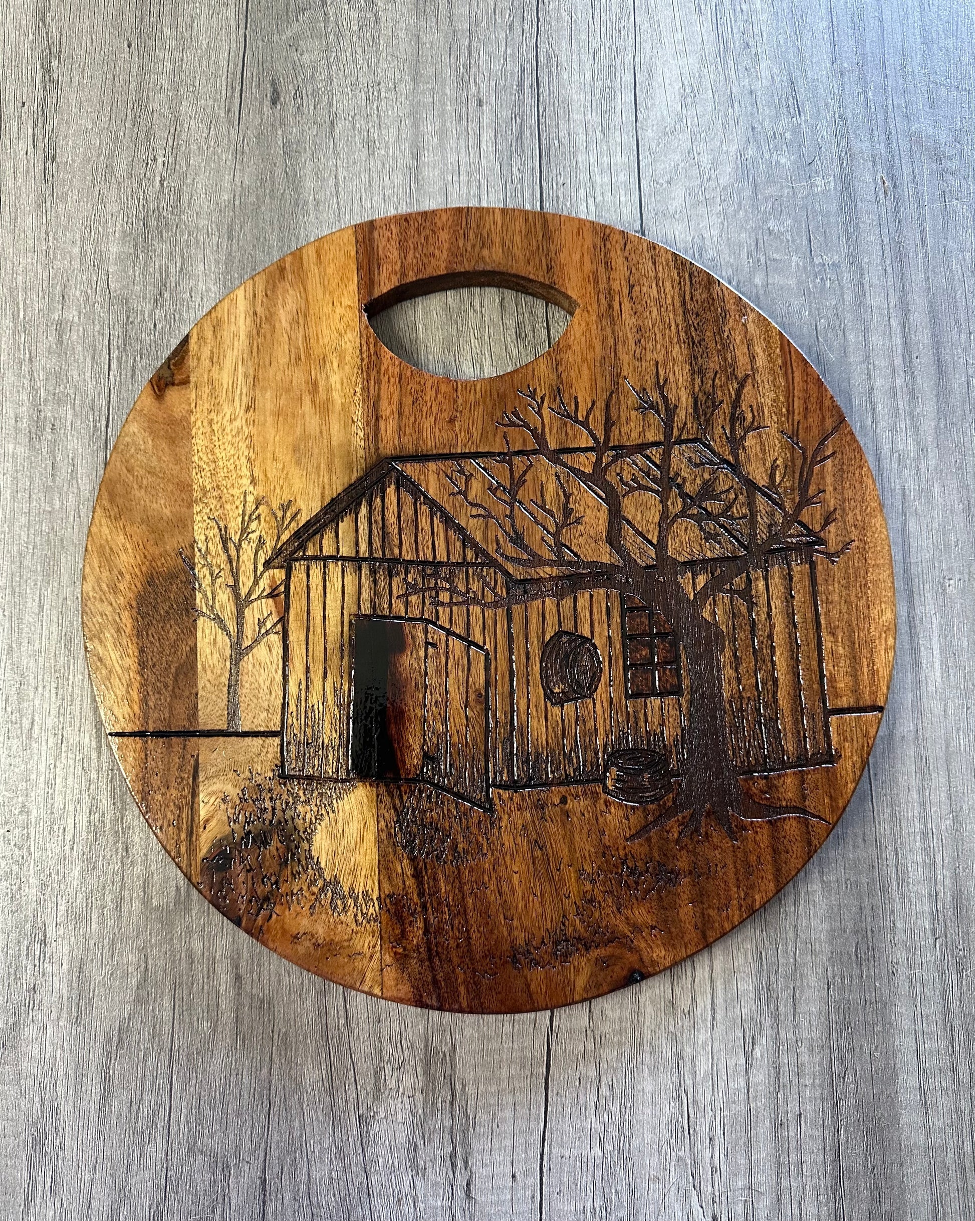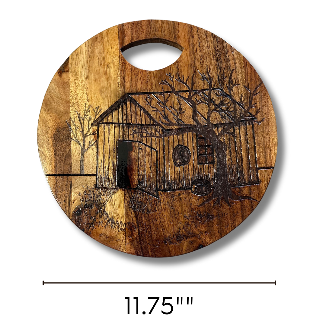 Crafted with care and attention to detail, this artisanal piece combines the rustic charm of aged wood with the timeless beauty of handcrafted art. Each line burned into this board tells a story, capturing the essence of the countryside and bringing life to your table reminding everyone of a much simpler time. Bring a slice of rustic elegance to your home with this board!
