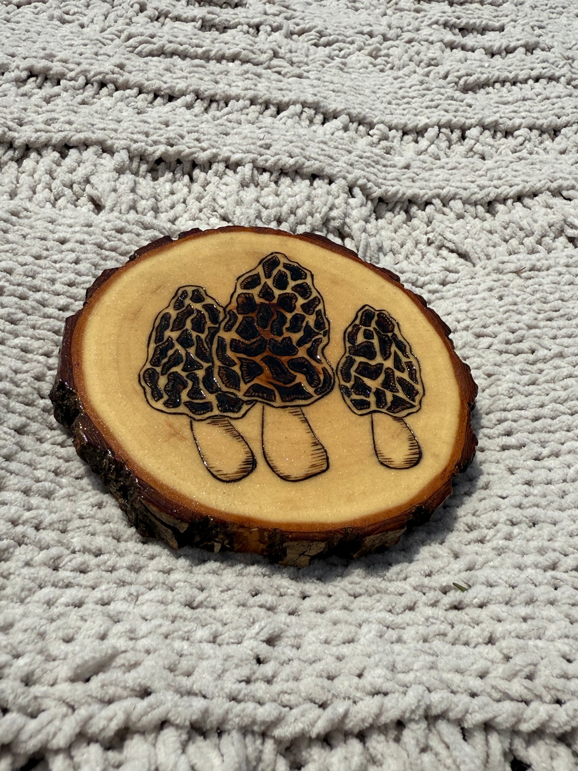 Featuring three intricately detailed morel mushrooms, each one is wood burned by hand with care and precision. The rich textures and natural tones highlight the unique shape and pattern of these beloved forest finds, making this coaster a small but striking piece of art.