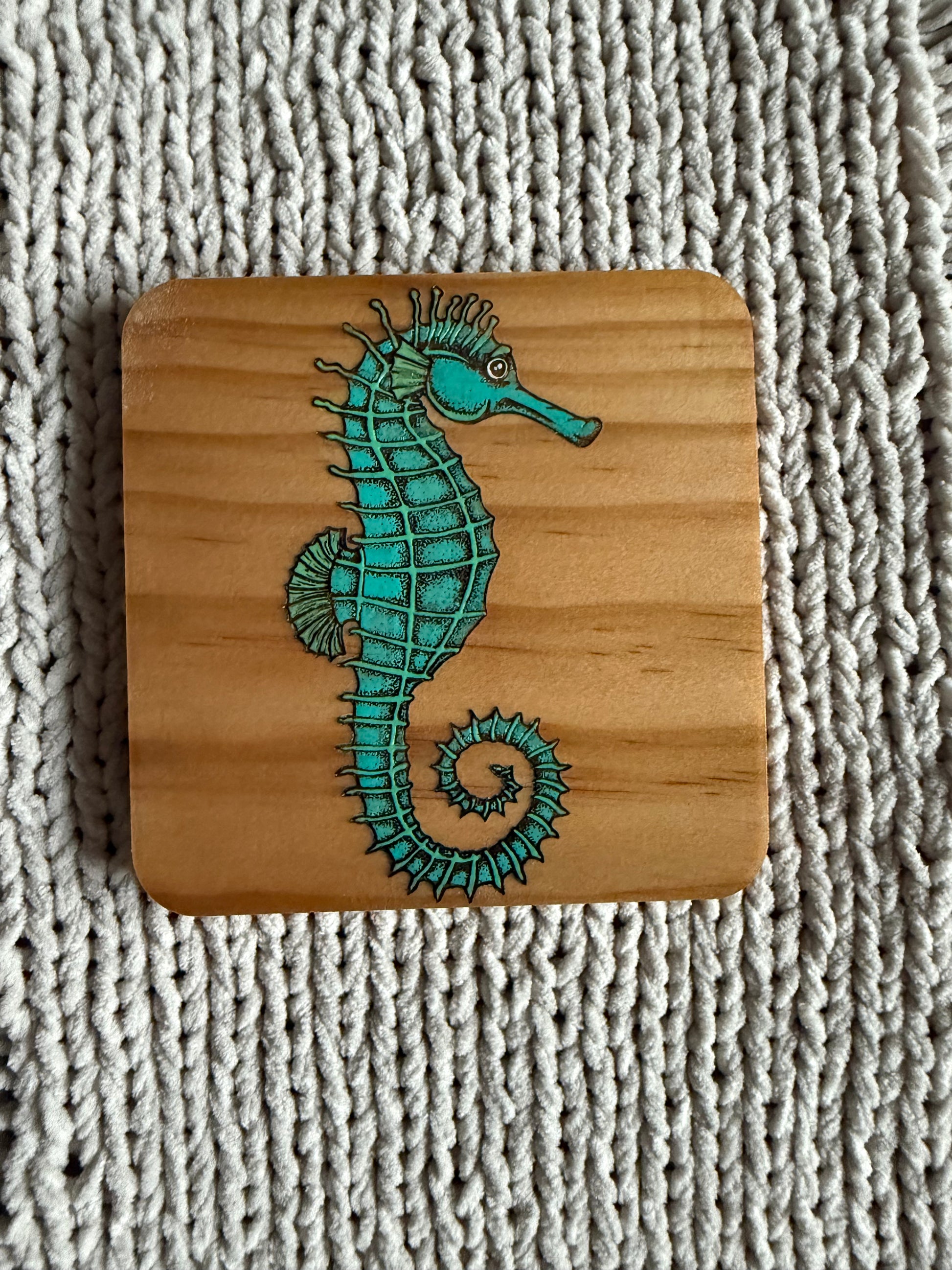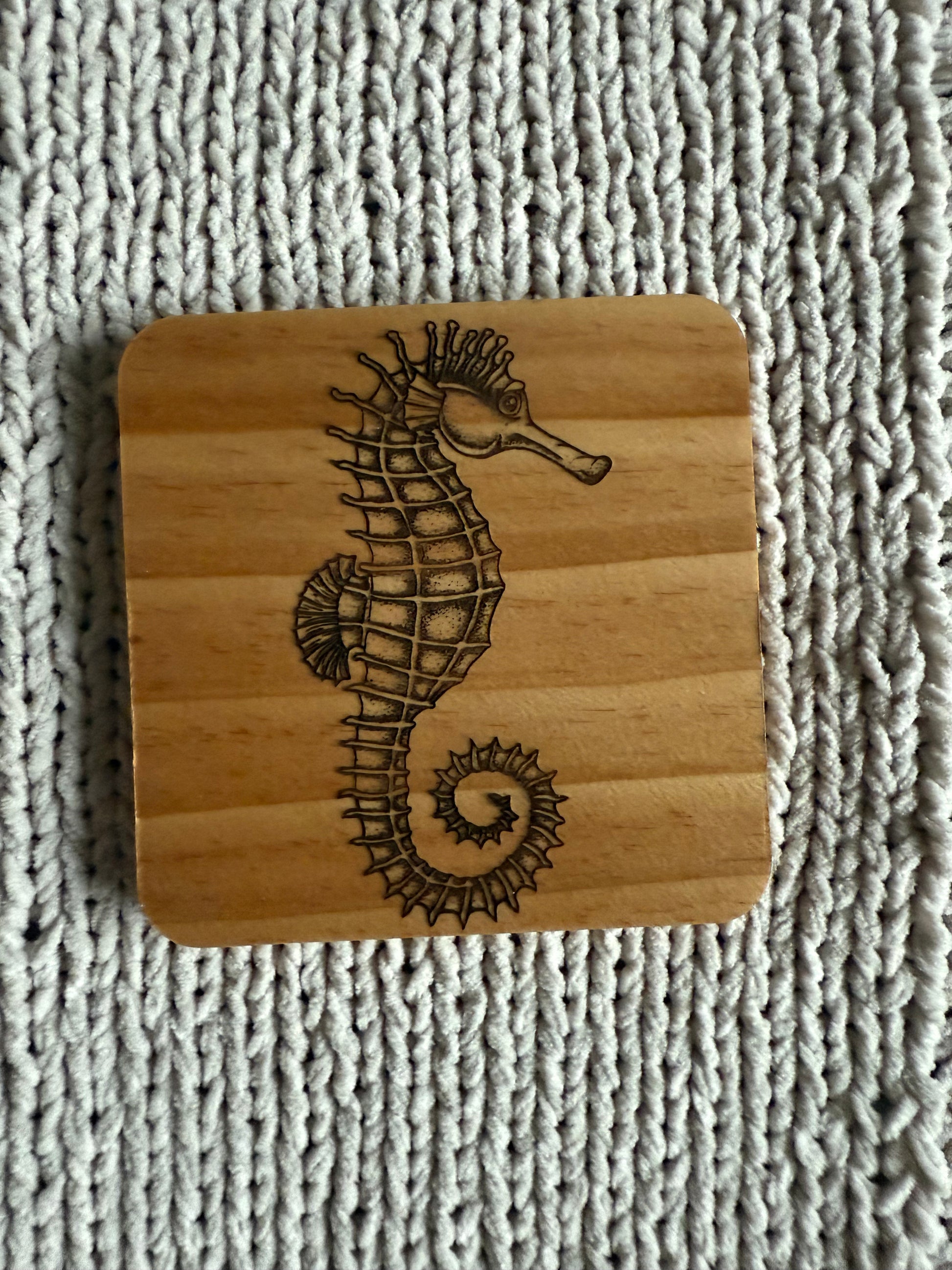 Each coaster features a highly detailed, hand-drawn seahorse design that has been laser engraved onto the wood, capturing the graceful beauty of this ocean creature. Choose between a sleek monochrome version for a timeless look or a hand-painted version.
